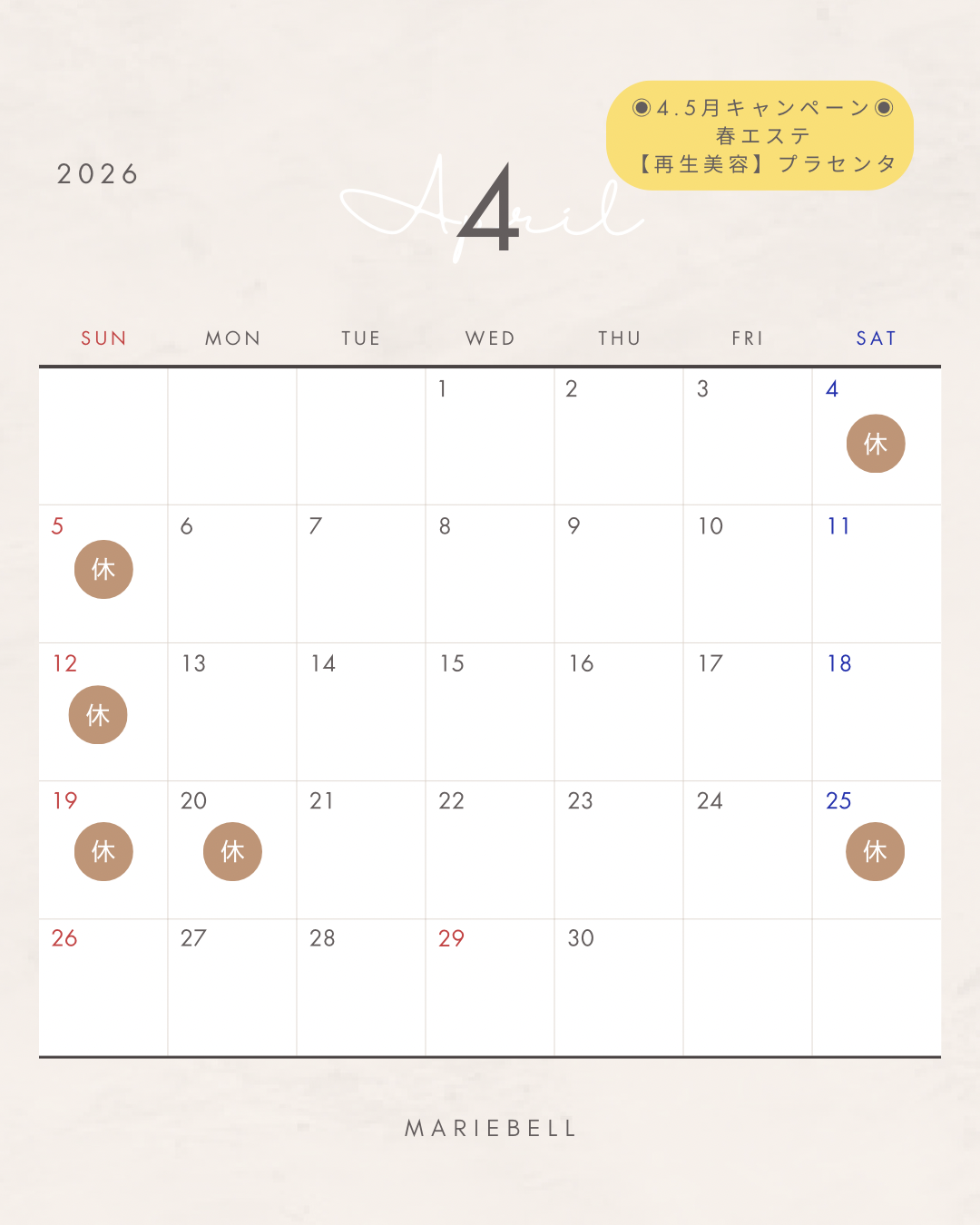 4月の定休日をお知らせします。